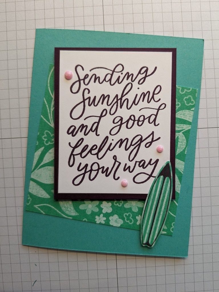 Since I had the Beach Day set out, I stamped “happy birthday” and a little beach ball on the inside in Blackberry Bliss. By the way, if you’re wondering about the stripes on the surfboard, that’s the back of the floral DSP!