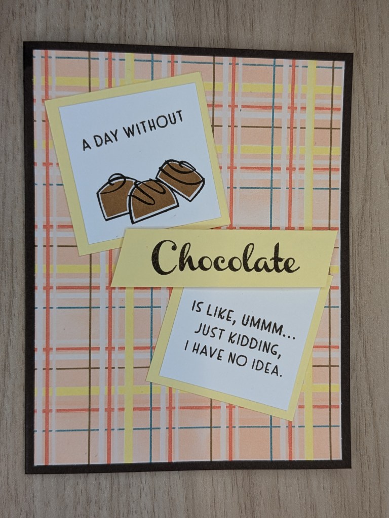 For the sentiment layers, I used Lemon Lolly mattes (2″ square) a quarter of an inch bigger than the Basic White squares (1 3/4″ square). The “Chocolate” sentiment on the very top, then, is a 3″ x 3/4″ rectangle with the edges trimmed on a diagonal. Only that layer is popped up with Dimensionals.